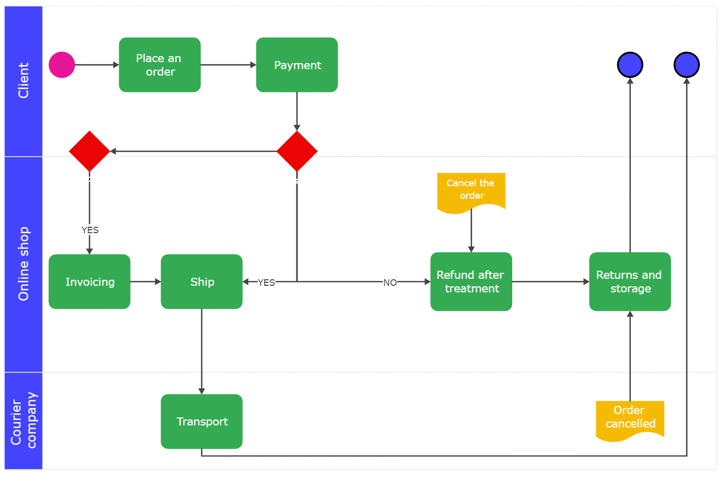 - Facilitates business process analysis and improvement: BPMN provides a clear visualization of business processes, thus facilitating business process analysis and improvement. By visually understanding business processes, they can be evaluated, changed, and improved more effectively.